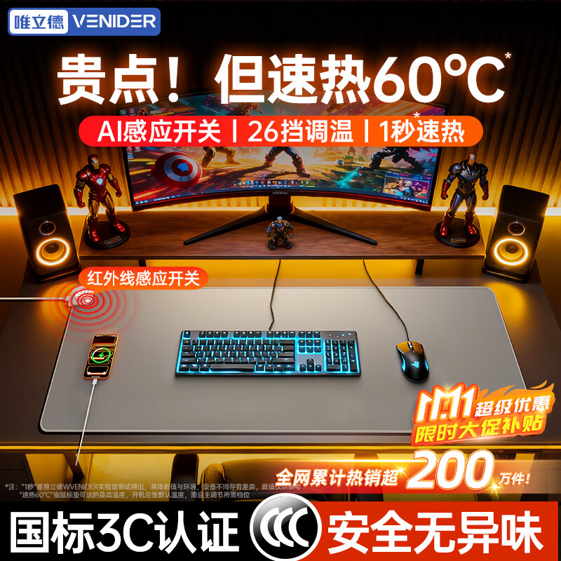 VENIDER1秒速热|3C认证】加热鼠标垫暖桌垫超大加长发热桌垫办公桌学生宿舍暖手神器学生写字台桌面加热垫 液态小羊皮【100*40cm】AI感应丨26档调温