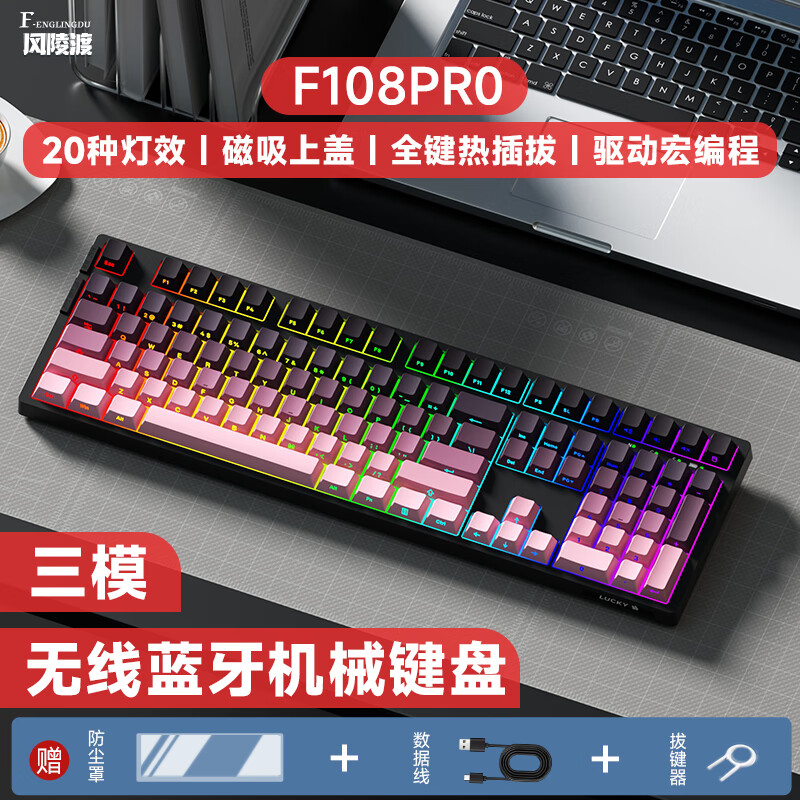 风陵渡F108pro三模机械键盘无线2.4G蓝牙有线全键无冲热插拔 磁吸式上盖男女生办公游戏键盘平板手机通用 主题版:黑莓渐变RGB灯光-三模 茶轴