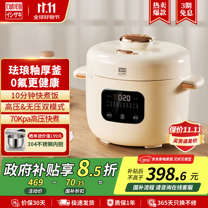 石崎成器日本 电压力锅 电饭煲 高压锅 家用多功能高压电饭锅快煮智能预约小型电压锅开盖火锅 胡椒白3L 3L