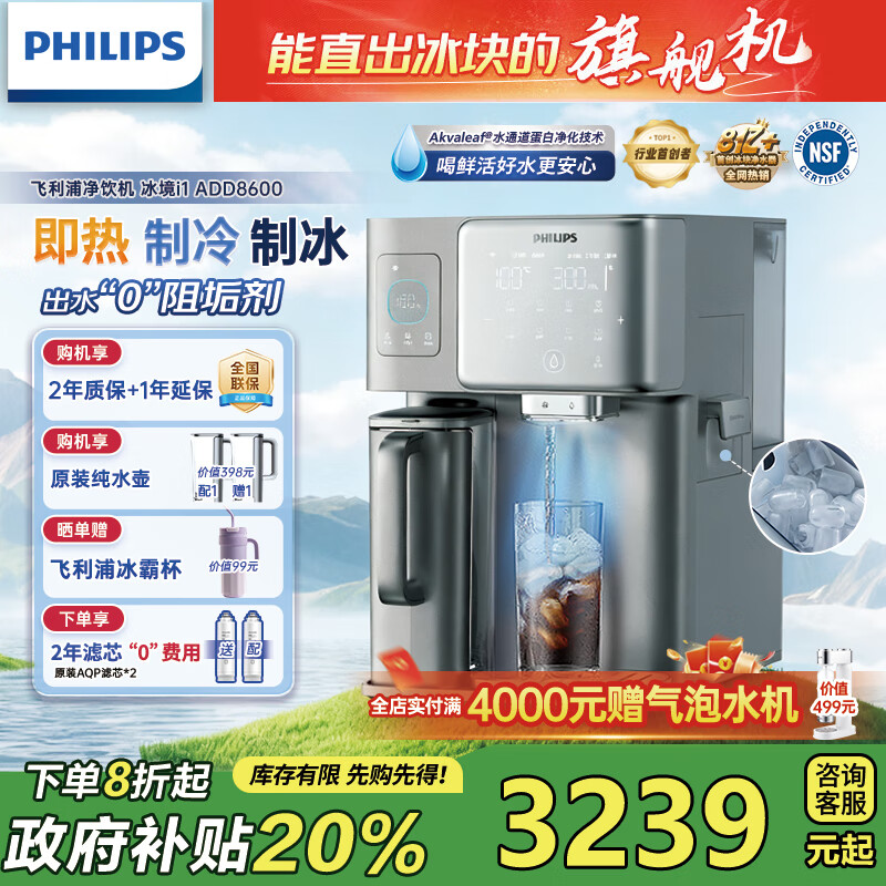 飞利浦(PHILIPS)冰块净水器家用台式即热免安装净饮机矿泉加热直饮一体机饮水机 冰境i1全自动制冰机ADD8600 【首创制冰功能】两芯装