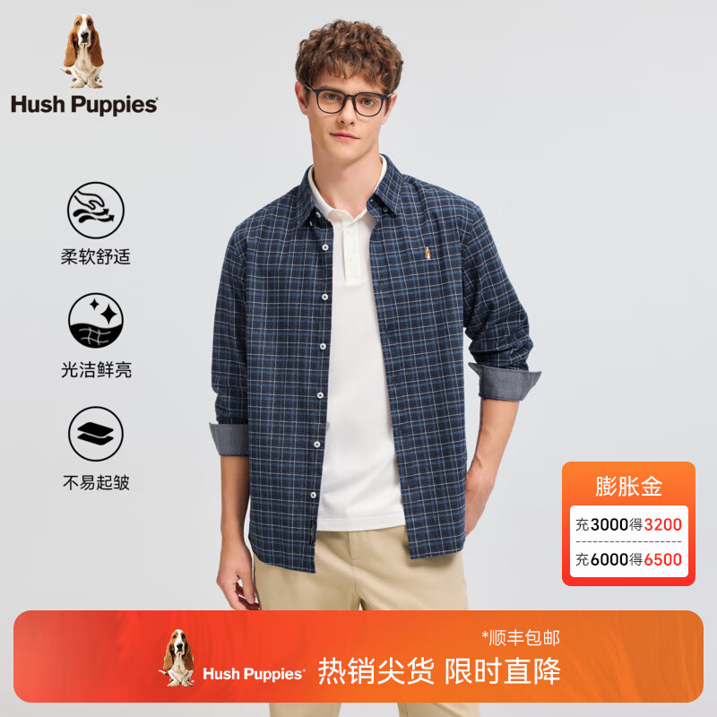 暇步士(Hush Puppies)【舒适磨毛】男装2025秋季经典格纹全棉磨毛长袖衬衫 墨蓝色 2XL