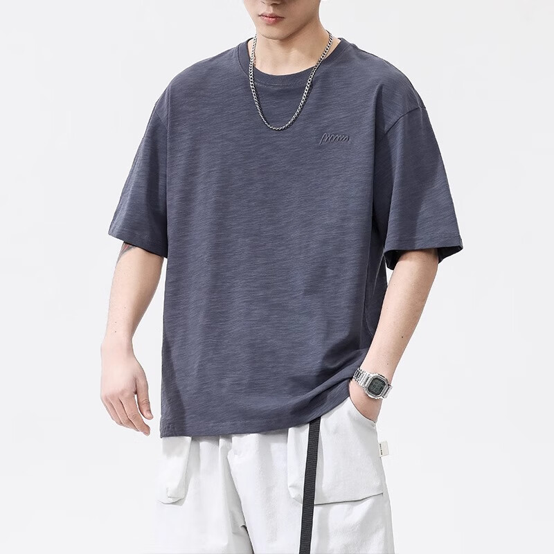 花花公子竹节棉t恤短袖男士夏季2025新款纯棉薄款男生圆领宽松纯色上衣服 深灰 XL