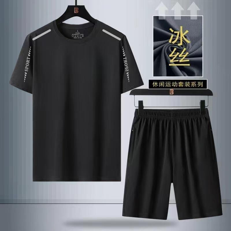 柯诗曼运动套装夏季冰丝速干短裤短袖运动服套装夏男士跑步速干衣服 连杆纯色套装【黑】- 3XL (建议145-160斤)