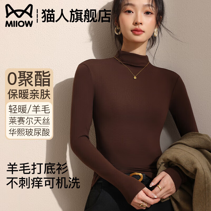 猫人一片式半高领上衣女秋冬百搭莱赛尔内搭羊毛打底衫长袖2025新款 巧克力色 云柔羊毛 德绒发热 玻尿酸润肤 XL 【推荐120-140斤】