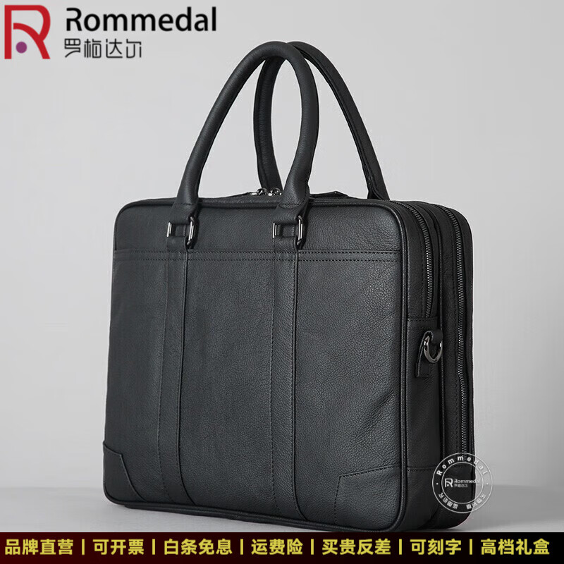 罗梅达尔(Rommedal)轻奢商务公文包男高端男士牛皮商务手提包真皮大容量多功能电脑包 黑色大号(黑线)44*29*12cm 头层牛皮