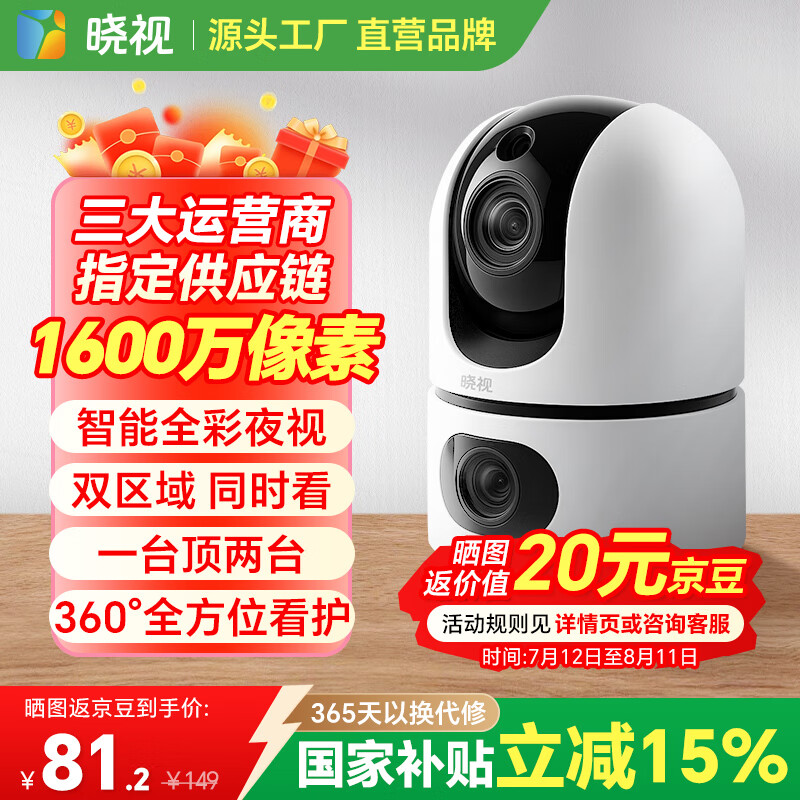 晓视双摄1600万智能家居摄像机监控器360度无死角带夜视高清家用摄像头无线wifi手机远程全景云台监控